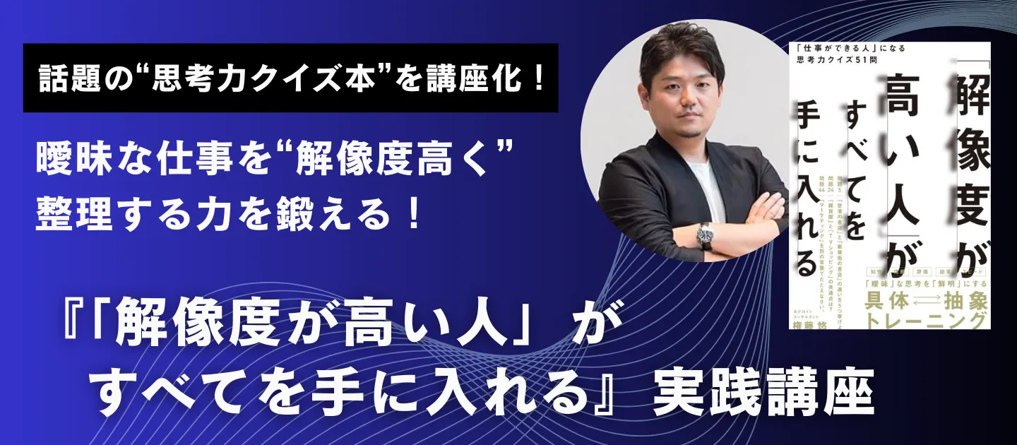 『「解像度が高い人」がすべてを手に入れる 「仕事ができる人」になる思考力クイズ51問』実践研修 テーマ 営業 ビジネス・問題解決スキル マーケティング デジタル・AI 企画・資料作成・プレゼン 形式 オンデマンド 対象者 マーケティングコミュニケーション担当者 マーケティング部門 マーケティング 新入社員 若手社員 中堅・マネージャークラス
