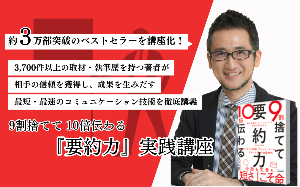 『9割捨てて10倍伝わる「要約力」』実践研修 テーマ コミュニケーション ビジネス・問題解決スキル マーケティング コピー・ライティング・文章力 広報・PR・経営管理 企画・資料作成・プレゼン 販売促進 形式 オンデマンド 対象者 マーケティングコミュニケーション担当者 マーケティング 新入社員 若手社員 中堅・マネージャークラス 部長・経営層